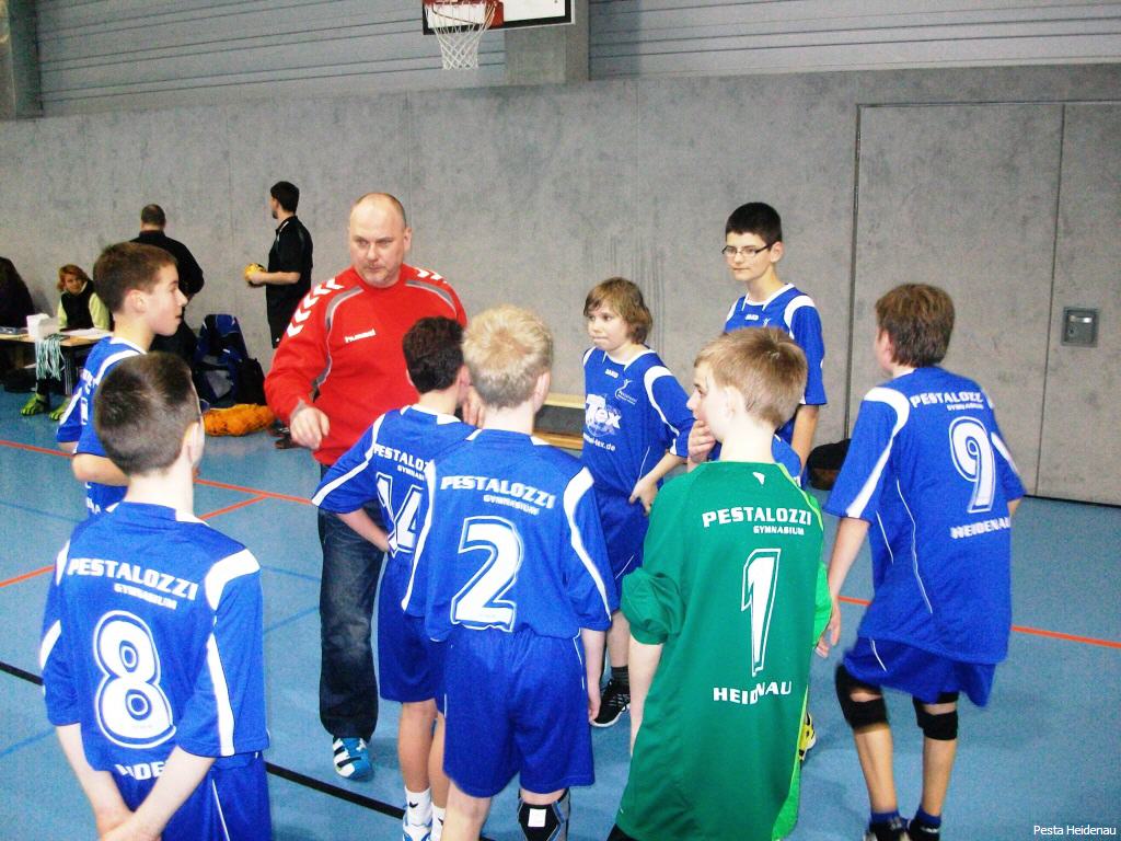 Jetzt galt es im letzten Spiel um Platz 5 noch einmal alles zu geben. In diesem Spiel ging es gegen das Gymnasium Borna. Da die Mannschaftsbetreuer mit dem bisherigen Einsatz nicht gänzlich zufrieden waren, wurde das Team anders aufgestellt. In der Anfangsphase war noch zu erkennen, dass sich das Team finden muss; tatsächlich kam aber etwas mehr Schwung in die Mannschaft. Die Halbzeit von 4:5 für Heidenau zeigt zwar, dass sich keiner richtig absetzen konnte, aber in der zweiten Halbzeit kam das Heidenauer Team endlich in Fahrt. Mit einer verbesserten Trefferquote (54%) und dem Willen, auch einfache Tore machen zu wollen sicherten sich die Jungs des Pestalozzi-Gymnasiums Heidenau den 5. Platz. Das Gymnasium Borna unterlag zum Schluss deutlich mit 6:13.
