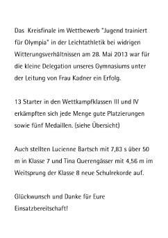 Am Donnerstag, den 12.06.2014, fand im Stadion „Am Kohlberg“ in Pirna das Kreisfinale „Jugend trainiert für Olympia“ statt, welches gleichzeitig die Austragung des Kreis-, Kinder- und Jugendsportfestes darstellte.