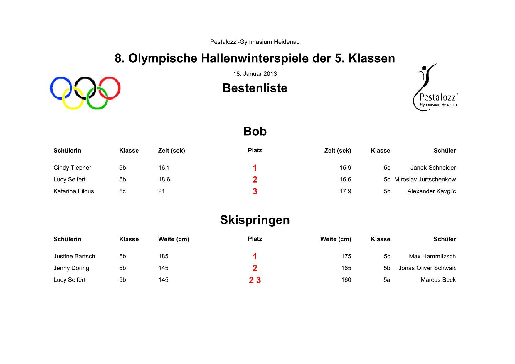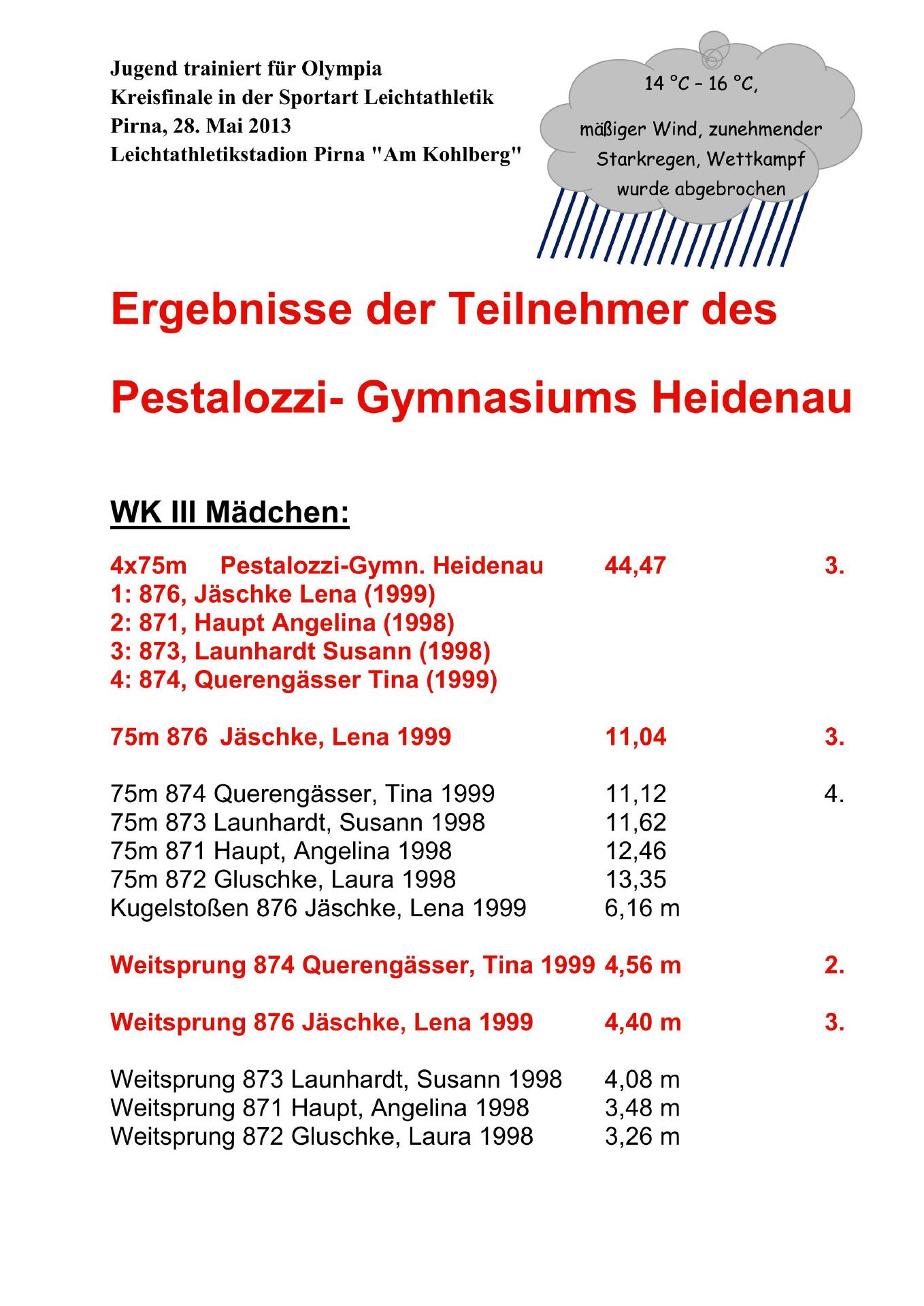 Am Mittwoch, dem 8. Mai 2013, fuhr die männliche Handballmannschaft WK IV (Jahrgänge 2000-2003) des Pestalozzi-Gymnasiums in Heidenau zum Landesfinale nach Bischofswerda. Dieses Landesfinale ist die höchste „Spielklasse“, die die Jungs in ihrer Wettkampfklasse beim Bundeswettbewerb der Schulen „Jugend trainiert für Olympia“ erreichen können.